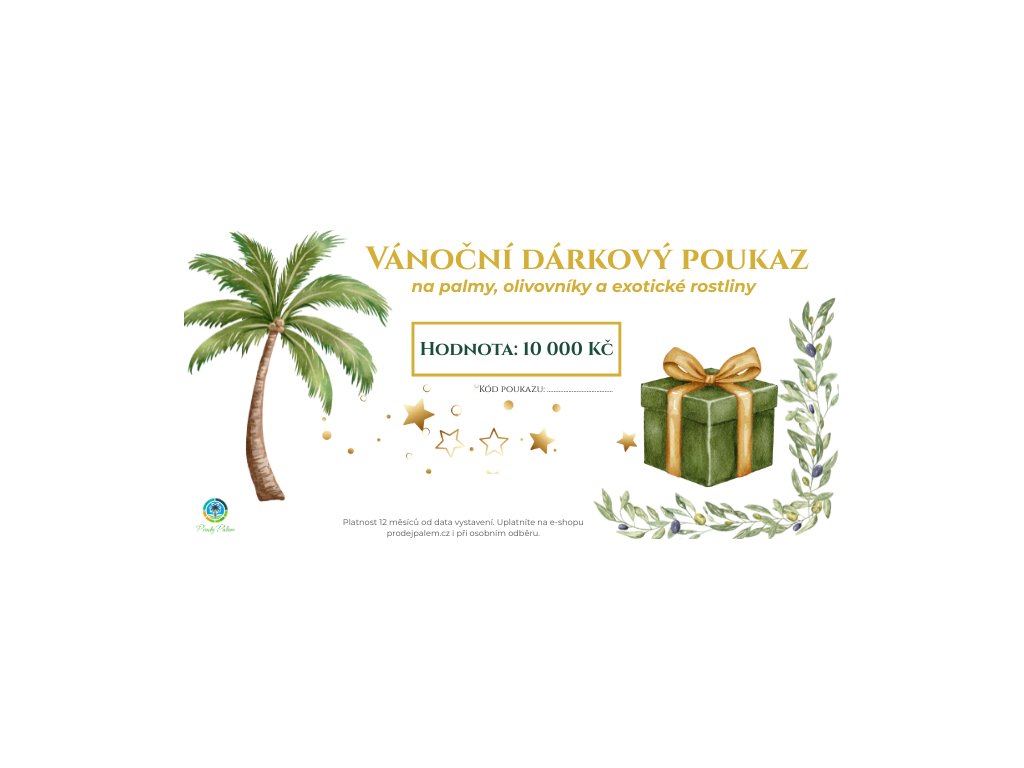 Dárkový poukaz v hodnotě 10000 Kč je skvělou volbou pro každého, kdo miluje palmy, olivovníky, juky nebo exotickou atmosféru ve své zahradě či na terase.